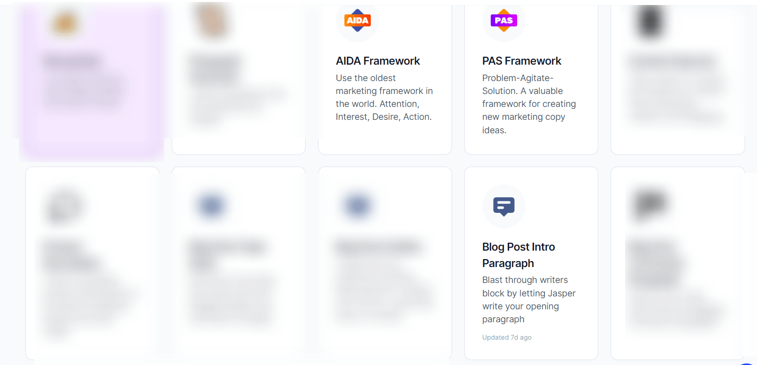 - When creating the blog intro. Writers in general, struggle from time to time coming up with catchy introductions. As a reference, we use Jasper’s template for Blog Post Intro Paragraph, PAS, and AIDA template. It will be a mix and match of the ideas that it generated.